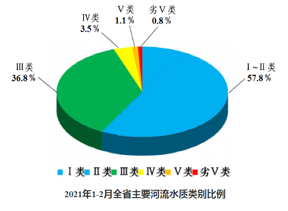 2021年1-2月,全省主要流域375個(gè)水質(zhì)評(píng)價(jià)斷面總體水質(zhì)為優(yōu)。Ⅰ~Ⅲ類水質(zhì)比例為94.6%,同比上升3.3個(gè)百分點(diǎn);Ⅰ~Ⅱ類水質(zhì)比例為57.8%,同比下降1.3個(gè)百分點(diǎn)。各類水質(zhì)比例如下:Ⅰ類占8.1%,Ⅱ類占49.7%,Ⅲ類占36.8%,Ⅳ類占3.5%,Ⅴ類占1.1%,劣Ⅴ類占0.8%。